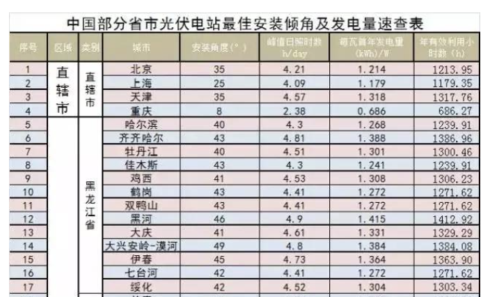 大家可以根據(jù)這個(gè)表格,查看各地合適的傾角。